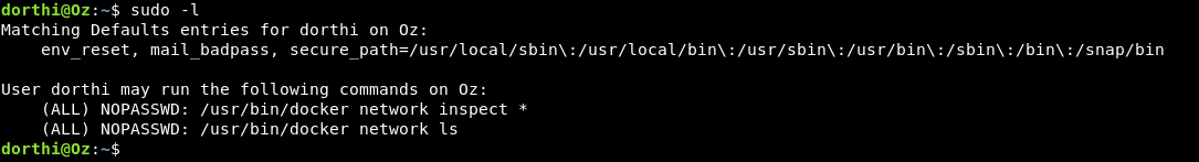 After some regular enumeration if we do sudo -l we will find that dorthi can run some commands as root docker network ls and docker network inspect *