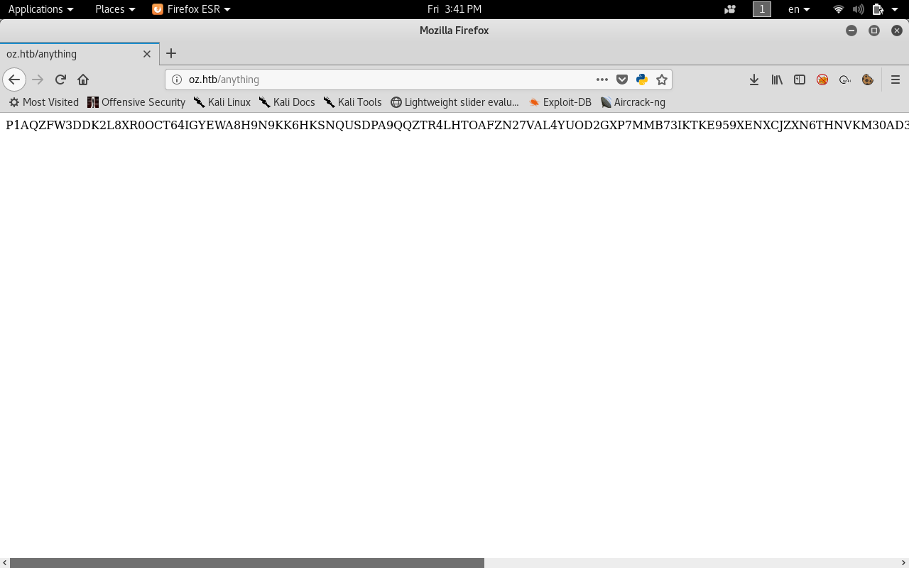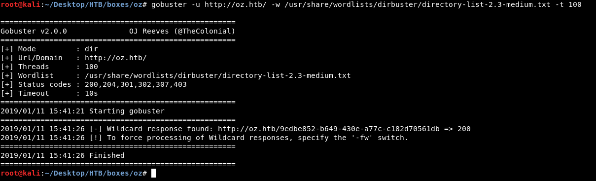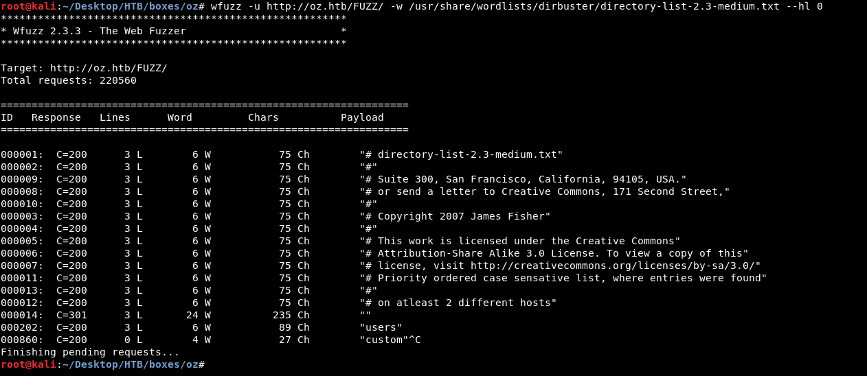 wfuzz -u http://oz.htb/FUZZ/ -w /usr/share/wordlists/dirbuster/directory-list-2.3-medium.txt --hl 0