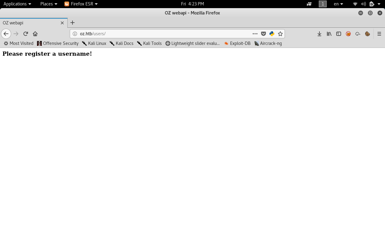 On port 80 there’s a web page with the title “OZ Webapi” and it’s asking us to register a username.