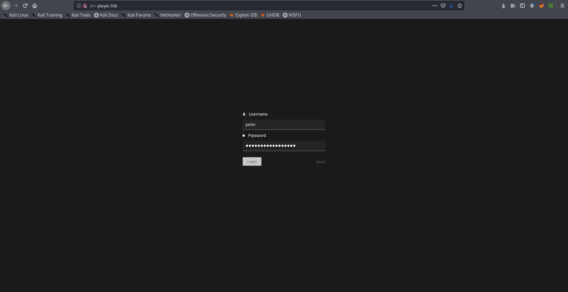 These credentials (peter : CQXpm\z)G5D#%S$y=) worked with dev.player.htb:
