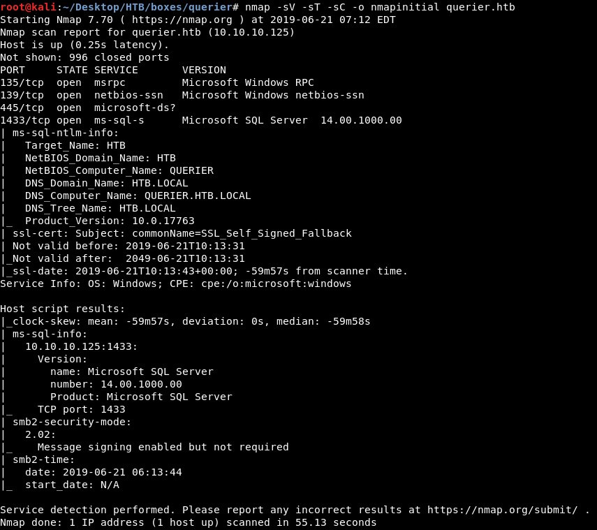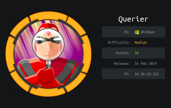 Hey guys today Querier retired and here’s my write-up about it. It was a great windows machine covering some interesting stuff and I enjoyed it.I wrote two posts for this machine, first one solving it with kali and the other one solving it with commando vm, you can find the second post here. It’s a Windows box and its ip is 10.10.10.125, I added it to /etc/hosts as querier.htb. Let’s jump right in!