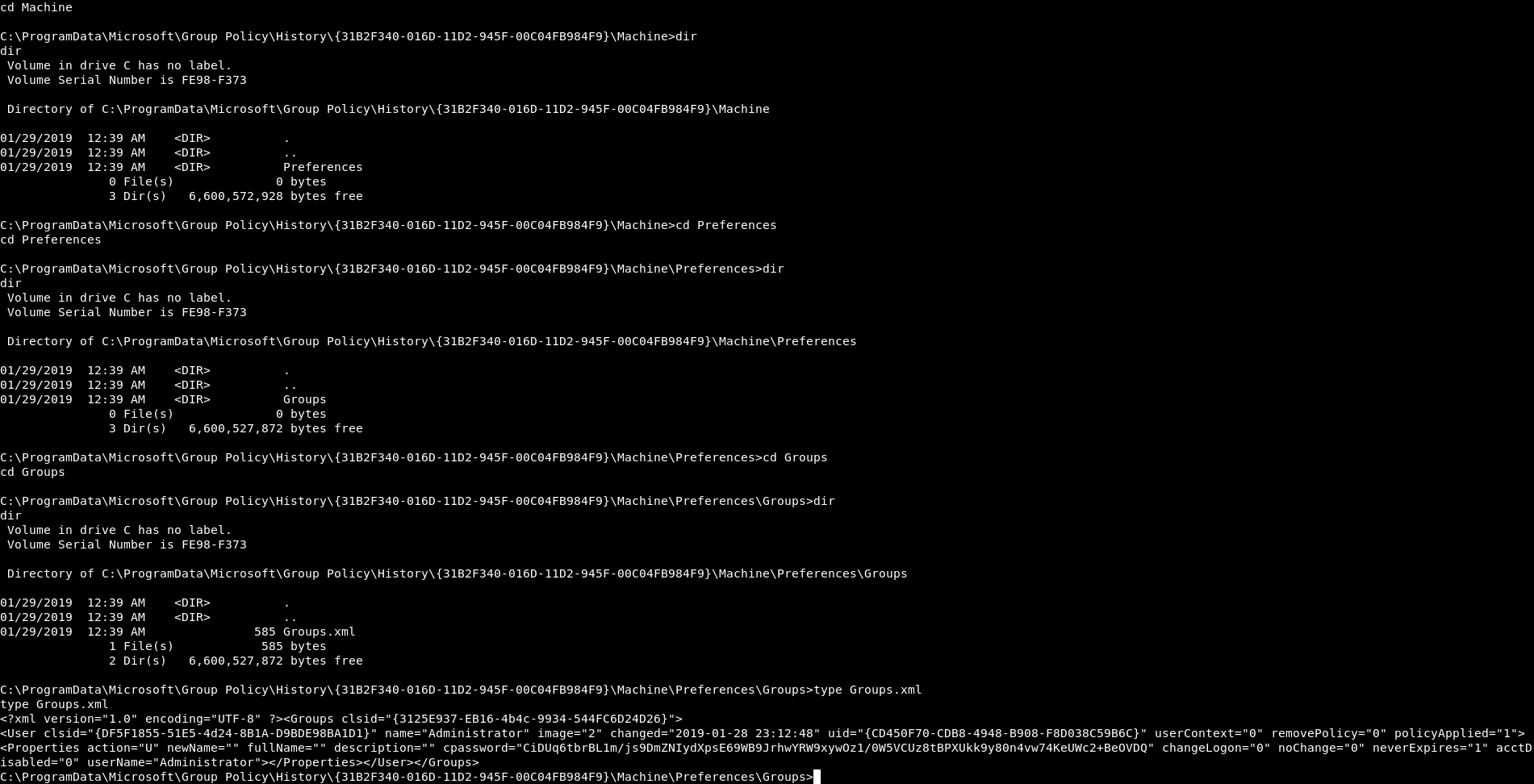 <Properties action="U" newName="" fullName="" description="" cpassword="CiDUq6tbrBL1m/js9DmZNIydXpsE69WB9JrhwYRW9xywOz1/0W5VCUz8tBPXUkk9y80n4vw74KeUWc2+BeOVDQ" changeLogon="0" noChange="0" neverExpires="1" acctDisabled="0" userName="Administrator"></Properties></User></Groups>