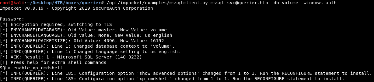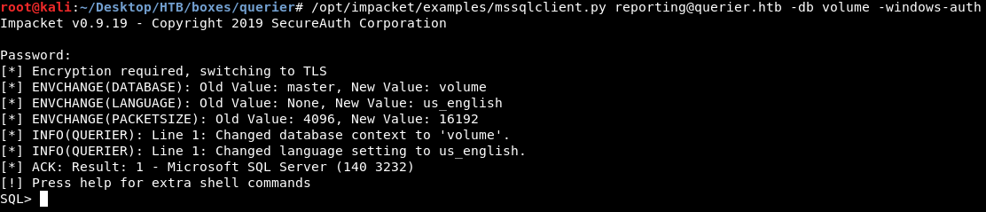 root@kali:~/Desktop/HTB/boxes/querier# /opt/impacket/examples/mssqlclient.py reporting@querier.htb -db volume