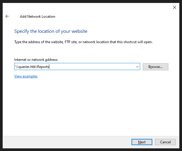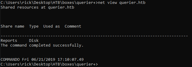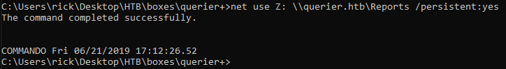 net use Z: \\querier.htb\Reports /persistent:yes