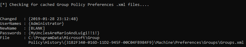 As I said in the first post, when I checked group policy passwords I found Administrator’s password. There are privilege escalation enumeration scripts for Windows like LinEnum.sh for Linux one of them is powerup.ps1 and it checks for group policy passwords. Let’s check that one :
