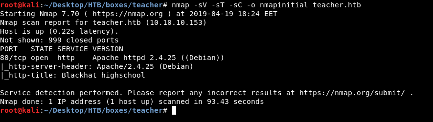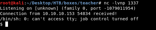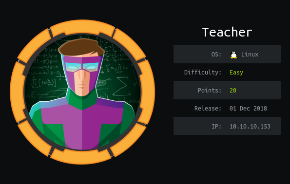 Hey guys , today Teacher retired and here is my write-up about it. I don’t have too much to say about this box. It was an easy regular machine , We will exploit an authenticated remote code execution in a vulnerable version of a web application called moodle to get an initial shell on the box. And for privilege escalation we will find a directory which permissions are set to read , write and execute by anyone , and from there we can create a symlink to /root or anything else we want to access. It’s a linux box and its ip is 10.10.10.153 I added it to /etc/hosts as teacher.htb. Let’s jump right in !
