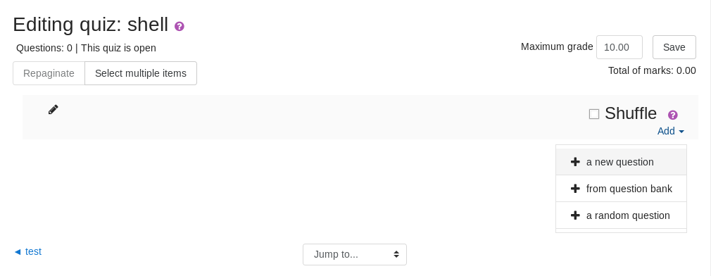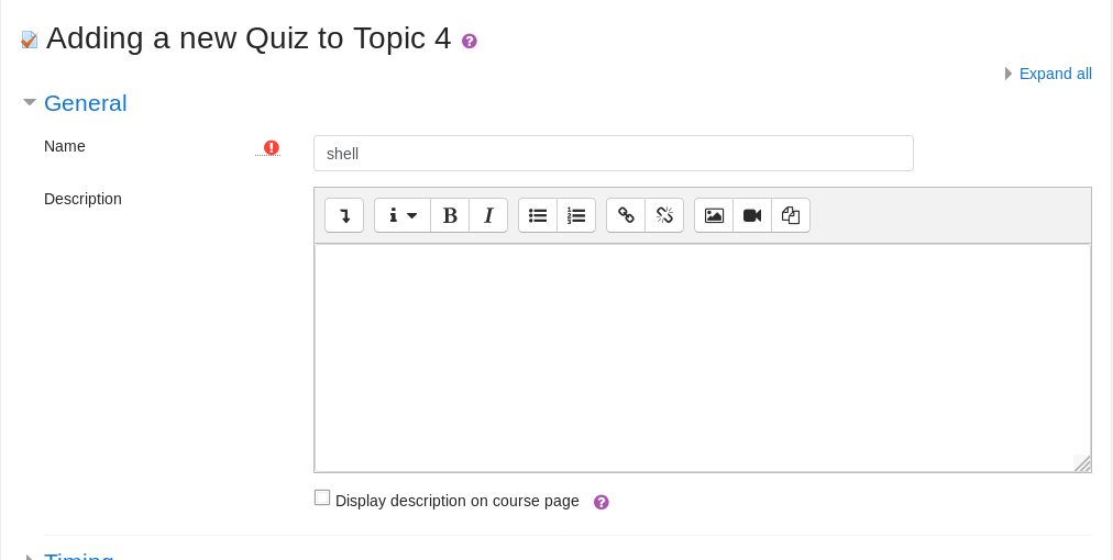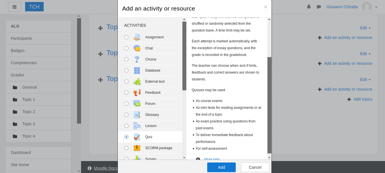 Now we can edit the course , so we will choose any topic and click on Add an activity or resource and we will choose Quiz :