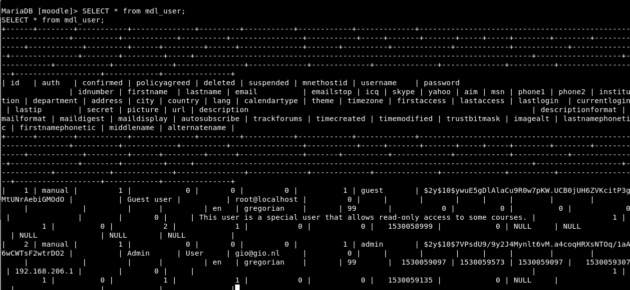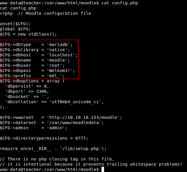Back to /var/www/html/moodle , I wanted to check config files and other stuff to see if there are any information that can help. And in config.php I found database credentials :
