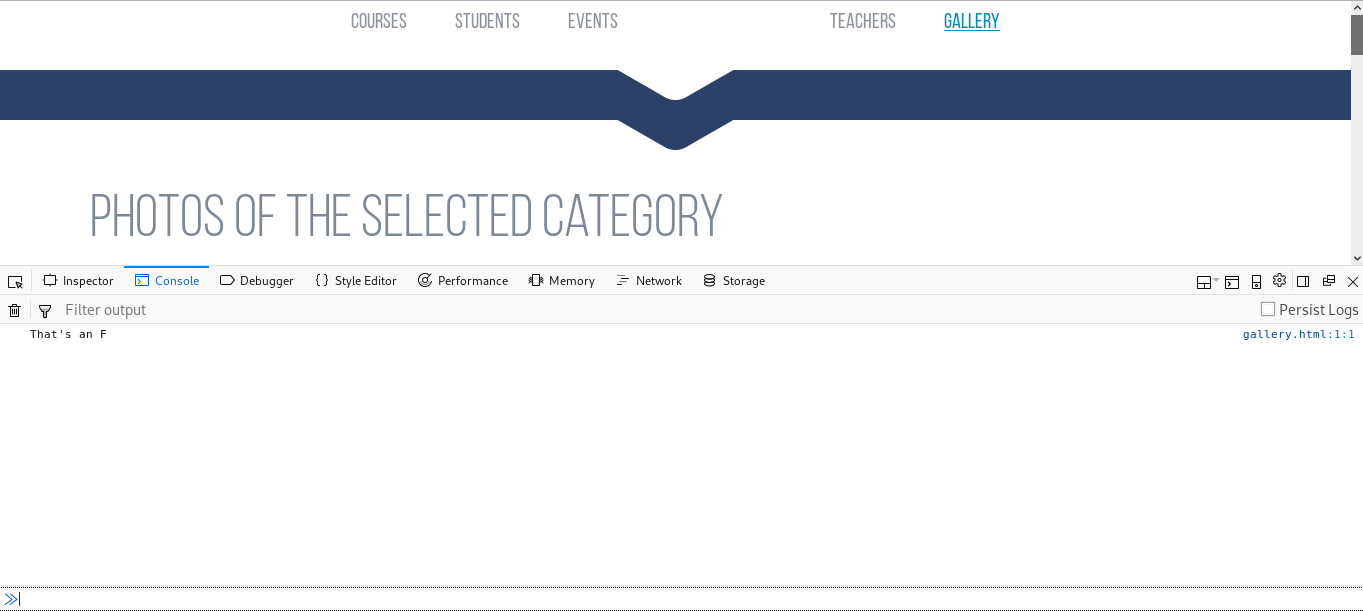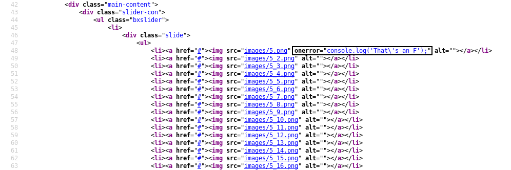 for <img src="images/5.png"> there is an onerror attribute to print That's an F in the console. So I checked the console :