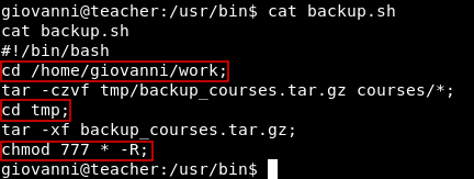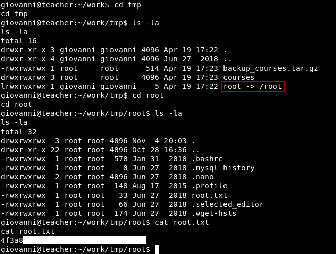 We don’t really care about the tar commands , What we care about is that it’s changing current directory to /home/giovanni/work then changes it once again to /home/giovanni/work/tmp then changes permissions to 777 recursively. This means that any user can read , write and execute any file in /home/giovanni/work/tmp. So if we created a symlink for /root in /home/giovanni/work/tmp and wait for the script to get executed by root (cronjob) we will have access to /root. In normal conditions creating a symlink to /root won’t let you have access to it if you don’t have the permissions to. Because it’s still linking to a directory that you are not authorized to access. But since the script runs chmod 777 on /home/giovanni/work/tmp recursively, Anyone has access to what’s in there even symlinks. This article explains it very well. Read this if you don’t know what’s a symlink.