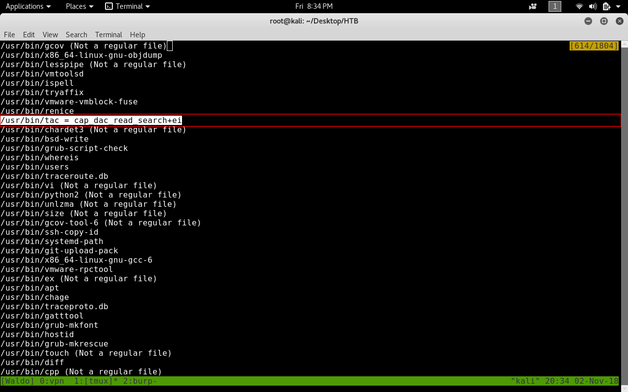 We will find under /usr/bin that a binary named tac has the cap_dac read_search+ei capability.