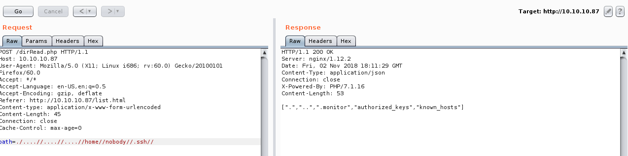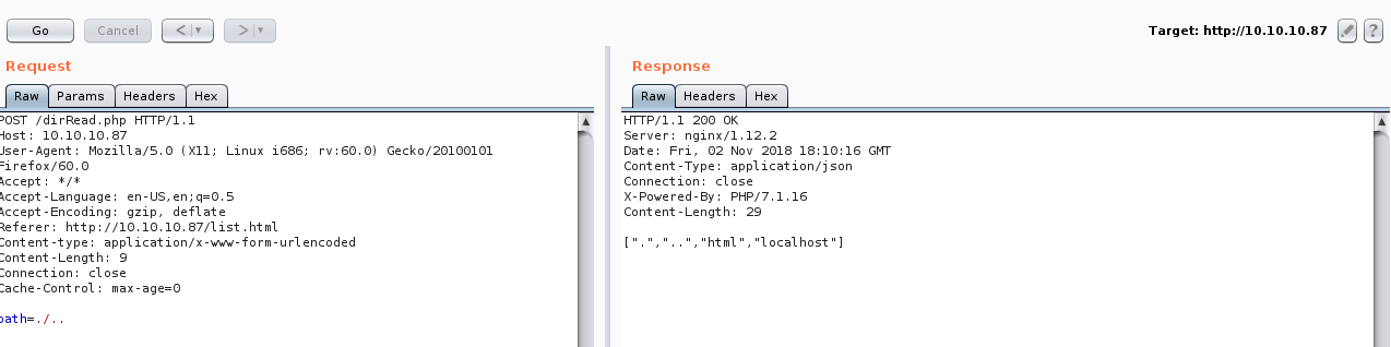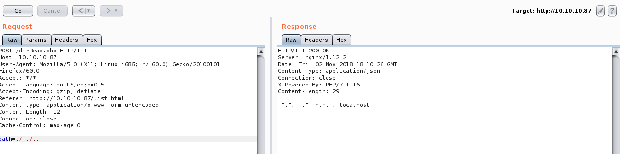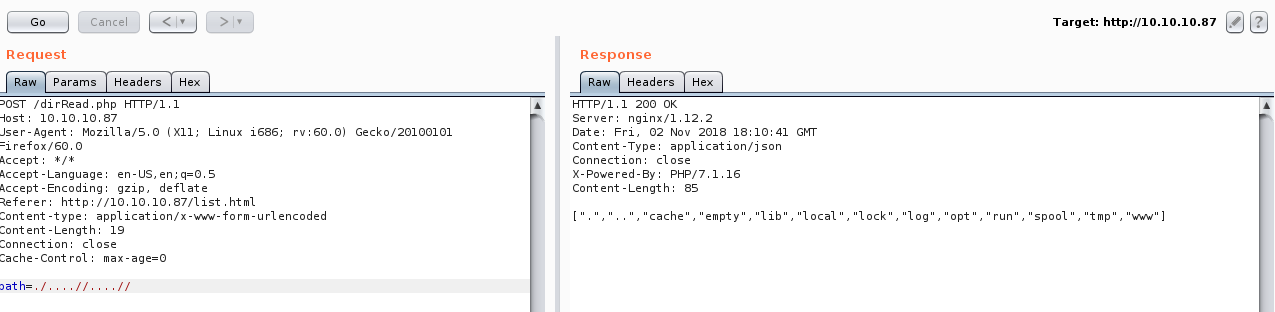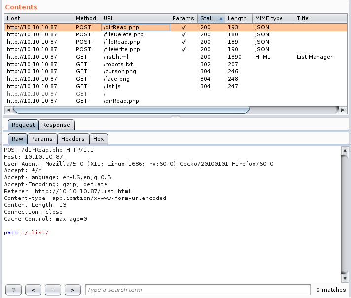 We will notice that dirRead.php lists the contents of a directory by giving the path in a POST request so we might have a path traversal vulnerability here.
