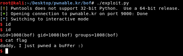 Hey guys it’s been a long time since my first pwn write-up, today I’ll write about another challenge from pwnable.kr called bof. It was a simple easy buffer overflow challenge (You can also check these), by overwriting a variable we can get a shell. I’ll also write a small exploit with pwntools that spawns a shell automatically.