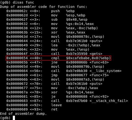 It stopped at the break point. We need to disassemble the function func() to get the address of the compare instruction that compares between the value of key and 0xcafebabe to set another break point there and look at the stack.