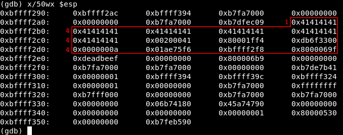 0xdeadbeef appears at the first row in front of 0xbffff2e0 and our input starts to appear at the last row in front of 0xbffff2a0. We can locate the distance between our input and 0xdeadbeef easily, each hex value represents 4 chars (0x41414141 == AAAA) and we have exactly 13 of them before 0xdeadbeef (1 + 4 + 4 + 4).