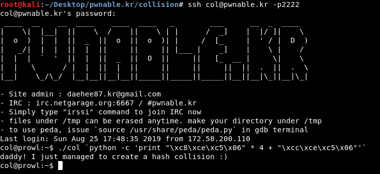 root@kali:~/Desktop/pwnable.kr/collision/test# ./test `python -c 'print "\xc8\xce\xc5\x06" * 4 + "\xcc\xce\xc5\x06"'`