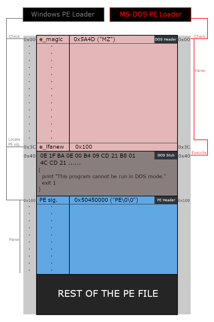 This header makes the file an MS-DOS executable, so when it’s loaded on MS-DOS the DOS stub gets executed instead of the actual program.