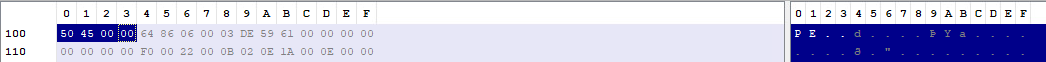 The last member of the header (at offset 0x3C) is given the name “File address of new exe header”, it has the value 100, we can follow to that offset and we’ll find the start of the NT headers as expected: