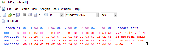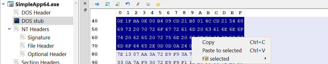 To be able to disassemble the machine code of the DOS stub, I copied the code of the stub from PE-bear, then I created a new file with the stub contents using a hex editor (HxD) and gave it the name dos-stub.exe.