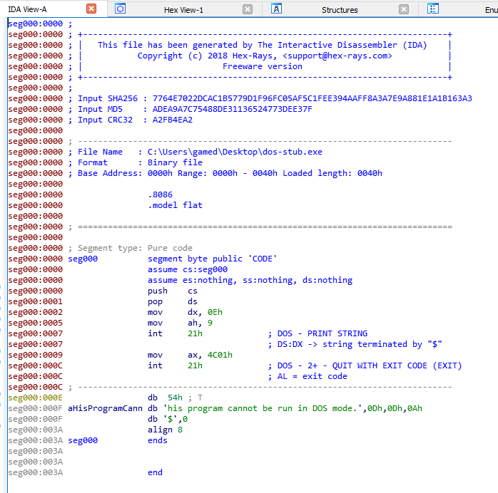 That’s all we need to know about the DOS stub, we don’t really care about it, but let’s take a look at what it’s doing just for fun.