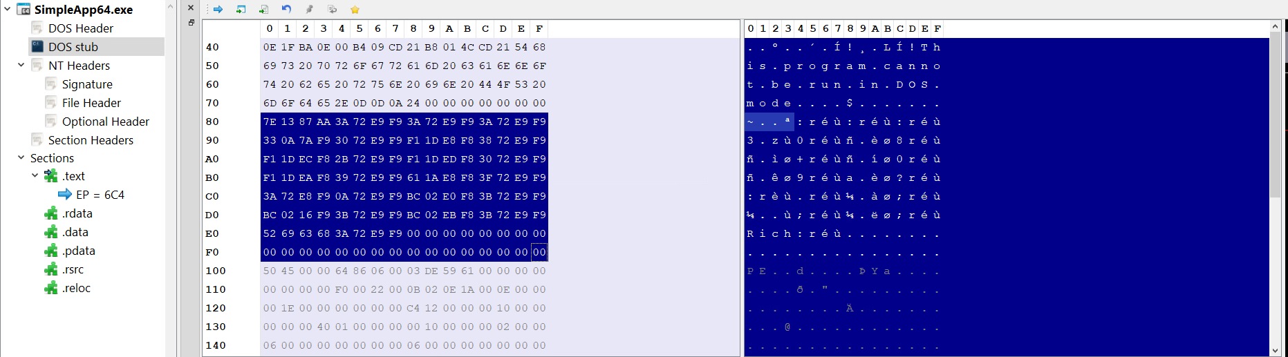 All of the resources I have read about PE files didn’t mention this structure, however when searching about the Rich Header itself I found a decent amount of resources, and that makes sense because the Rich Header is not actually a part of the PE file format structure and can be completely zeroed-out without interfering with the executable’s functionality, it’s just something that Microsoft adds to any executable built using their Visual Studio toolset.