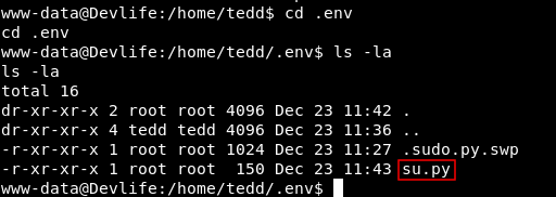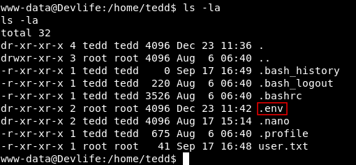 In the /home directory of tedd there is a directory called .env , Let’s check that.