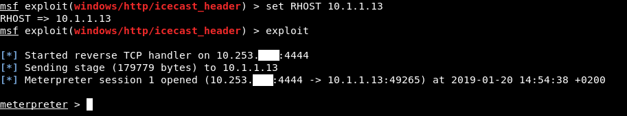 By searching online we will find that an old version of icecast had a buffer overflow vulnerability which allowed for a remote code execution (RCE). And we also find a metasploit module . So let’s open metasploit and search for icecast modules.